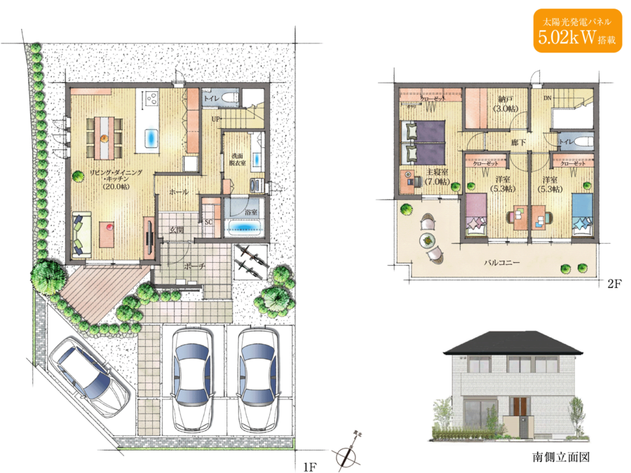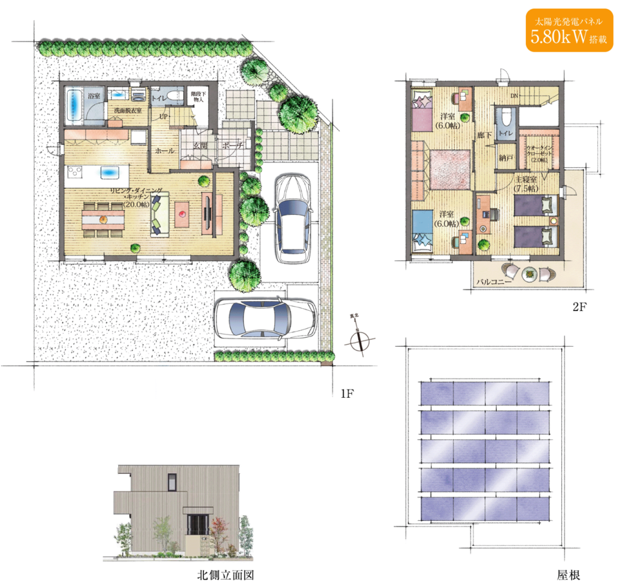 ※掲載の建物外観イラスト、間取りイラストは、図面を基に描き起こしたもので、外観、外構、植栽、敷地外等の植栽等、実際とは異なる場合があります。また、周辺の建物等は省略しております。