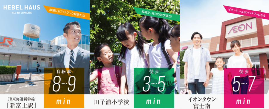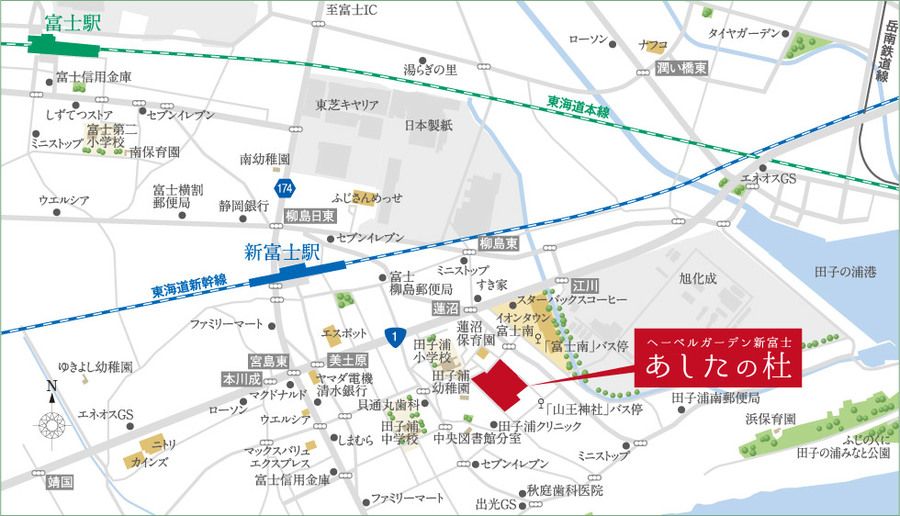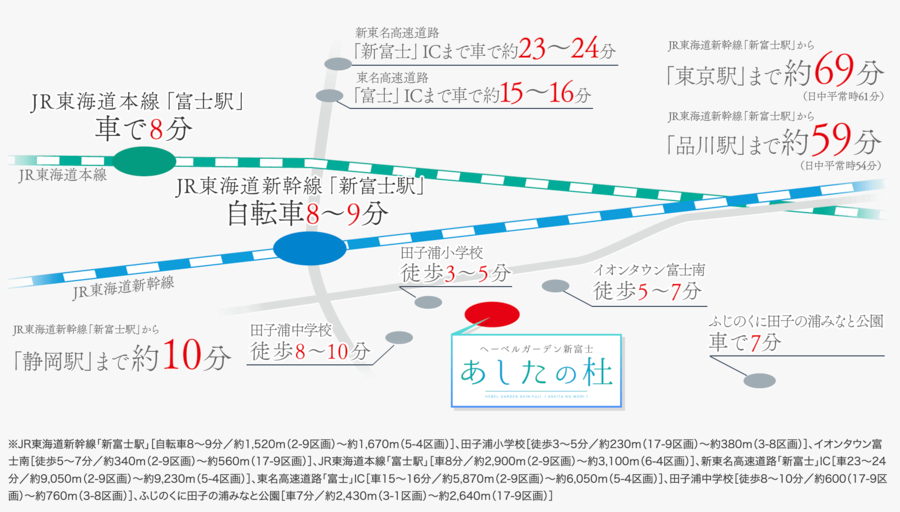 - JR東海道新幹線「新富士」駅徒歩19分~21分[約1,520m(2-9区画)〜約1,670m(5-4区画)]