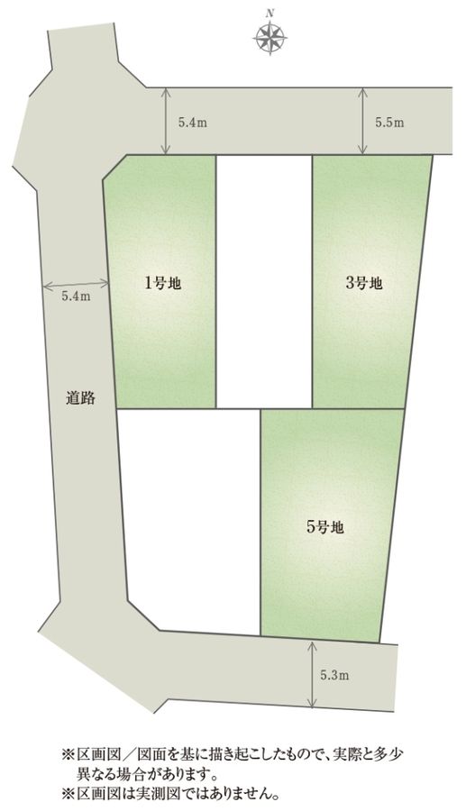 - 177.06m2(1号地)、176.75m2(3号地)、200.03m2(5号地) 私道負担なし