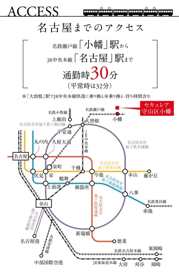 「小幡」駅から所要時間10分の「大曽根」駅からは、地下鉄名城線、JR中央本線が利用でき、通勤・通学に便利です。