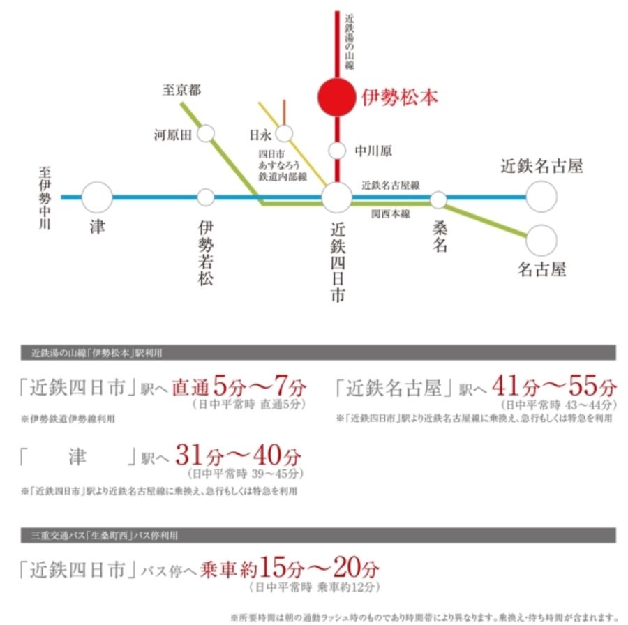 近鉄名古屋「近鉄四日市」駅まで三交バス約15分~20分(徒歩9分~11分の「生桑町西」バス停乗車)