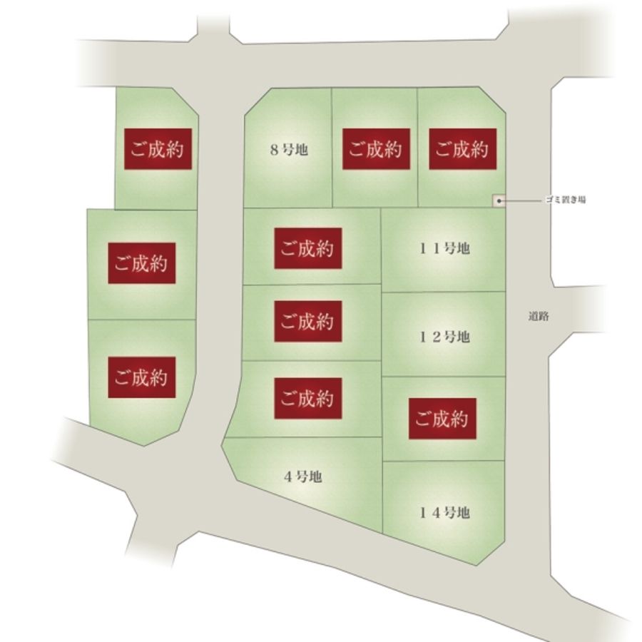 - 181.61m2(4号地)、174.81m2(8号地)、180.45m2(11号地)、179.26m2(12号地)、189.67m2(14号地) 私道負担なし