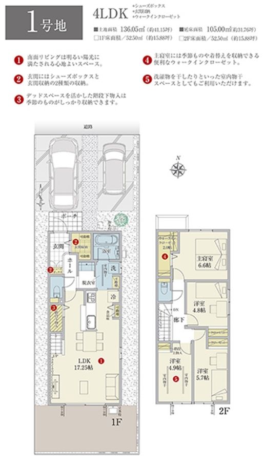 - 136.05m2(1号地)、136.01m2(2号地) 全て私道負担なし