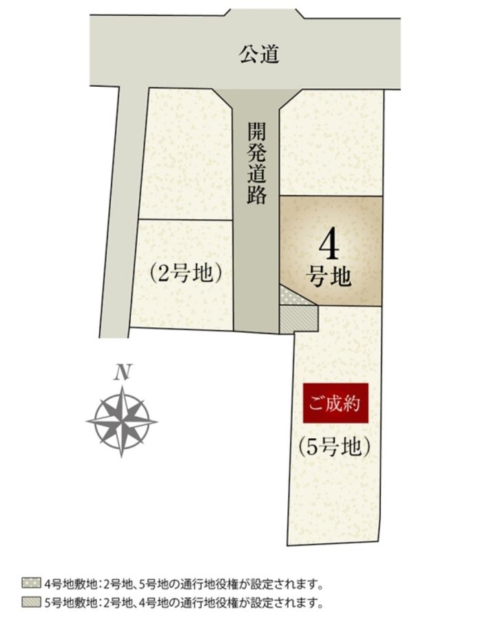 ●※4号地の敷地面積123.54m2のうち3.21m2の部分には2号地、5号地の通行地役権が設定されます。
