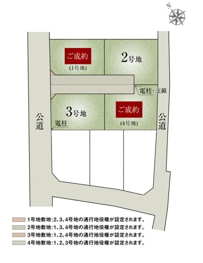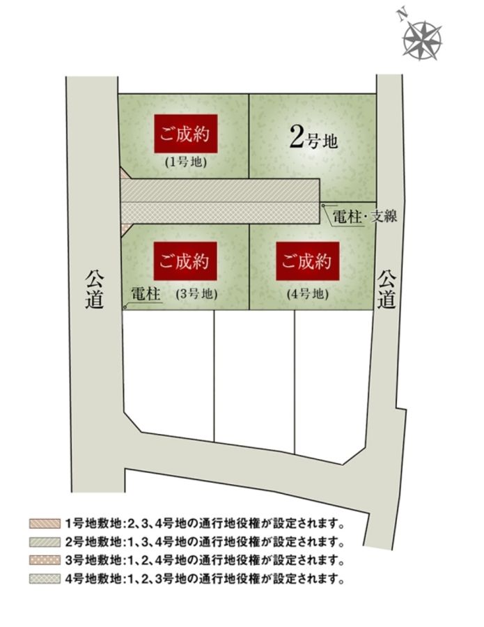 2号地土地面積185.13m2のうち50.60m2には1号地・3号地・4号地の通行地役権を設定します。