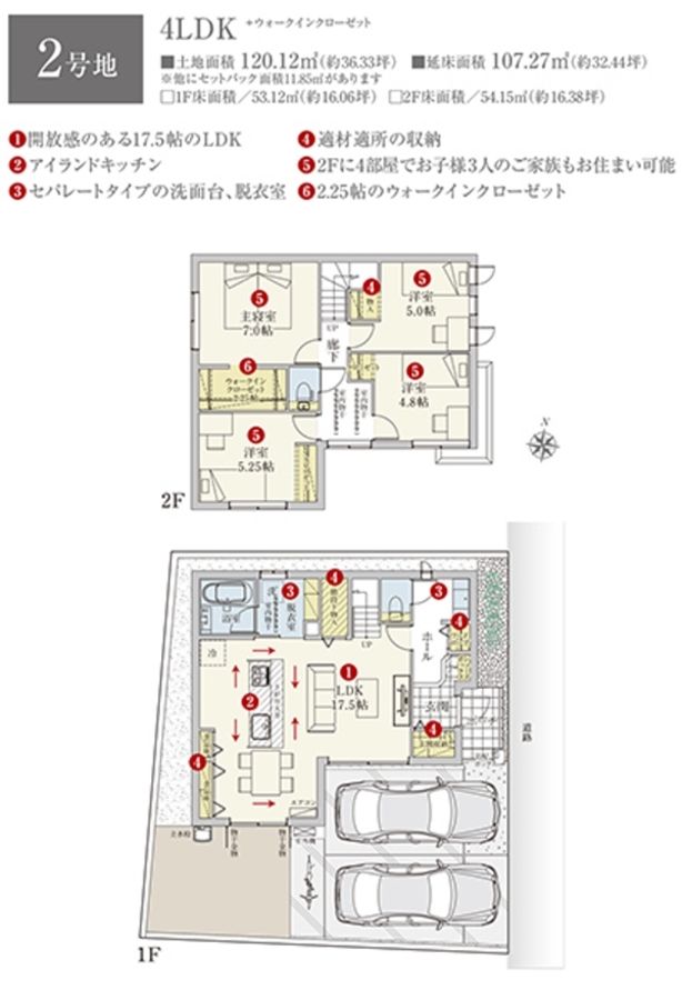 2号地は土地面積120.12m2の他にセットバック面積11.85m2があります。