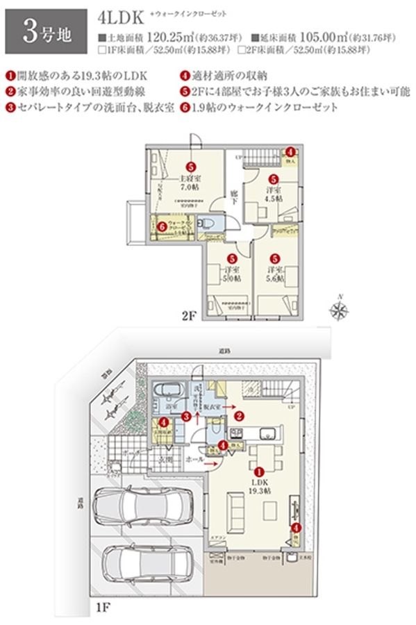 (物件概要補足)●物件名称/セキュレア岩倉大地町(分譲住宅)●所在地/愛知県岩倉市大地町郷内1143番11●総戸数/5戸●当社戸数/5戸●販売戸数/1戸●売主/大和ハウス工業株式会社●販売会社(取引態様)/売主●交通/名鉄犬山線「岩倉」駅まで徒歩12分●建物面積/105.00m2(3号地)●土地面積および私道負担/120.25m2(3号地) 私道負担なし●構造および階数/軽量鉄骨2階建(1戸)●工事完了年月/令和8年1月完成済 1戸●引渡可能年月/即引渡可 1戸●販売価格(税込)/5,348万円●最多販売価格帯/-●その他の費用/-●間取り/4LDK(3号地)●主たる設備等の概要/電気:大和ハウス工業(他の小売電気事業者の選択も可能です)、ガス:都市ガス、水道:公営水道、下水:公共下水道●道路の幅員/5m、7.6m(アスファルト舗装) ●建築確認番号/第25WHEC確建名01987号●土地の権利形態/ 所有権●用途地域/都市計画 第一種中高層住居専用地域/市街化区域