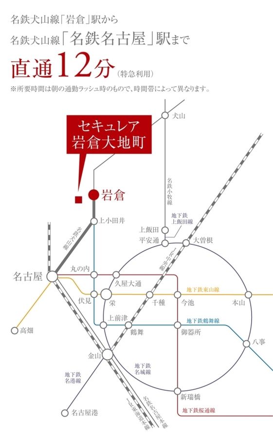 名鉄犬山線「岩倉」駅まで徒歩12分、「名鉄名古屋」駅まで特急利用直通12分(通勤時)