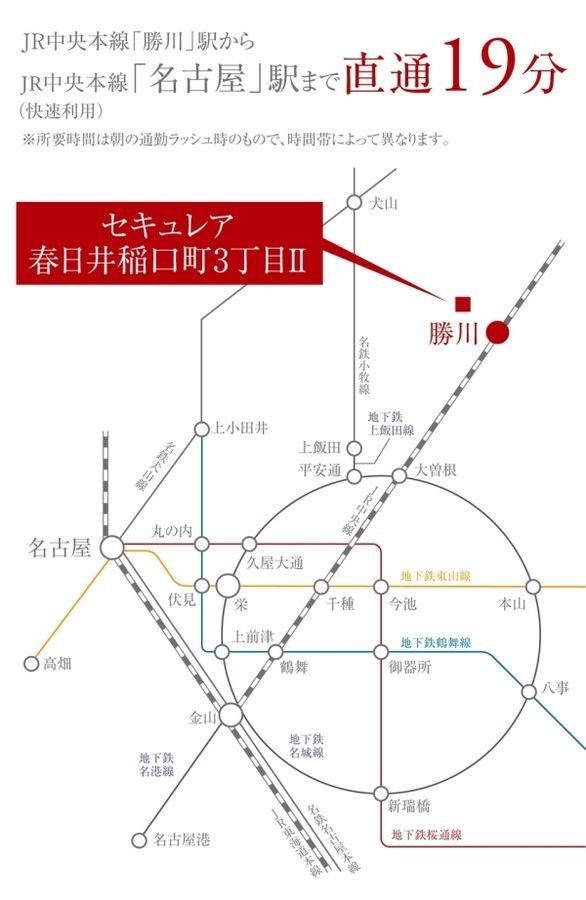 JR中央本線「勝川」駅から快速利用で「名古屋」駅まで直通19分と、