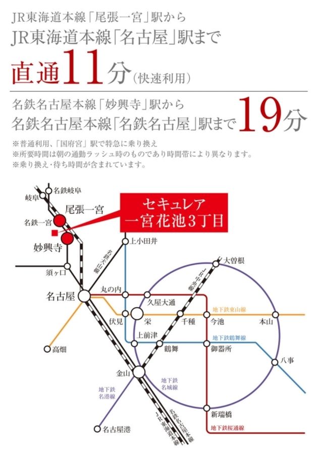 「妙興寺」駅から「名鉄名古屋」駅まで特急利用で19分と通勤通学に便利です。