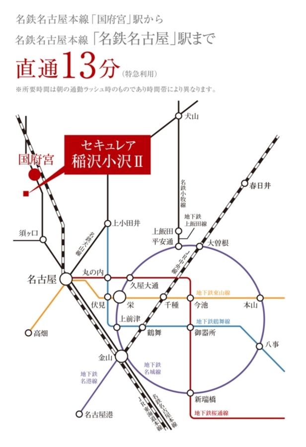 徒歩11分の名鉄「国府宮」駅から「名鉄名古屋」駅まで通勤ラッシュ時、特急13分。