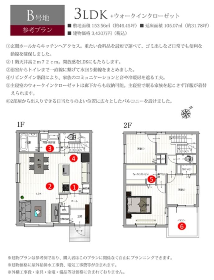 - 153.78m2 私道負担なし(A号地)、153.56m2 私道負担あり 1.74m2の負担持分(B号地)