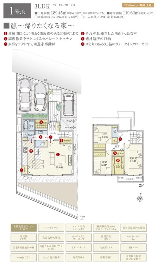 太陽光発電約3.19kW搭載しており、電気代の削減が期待でき、地球にも優しい家です。