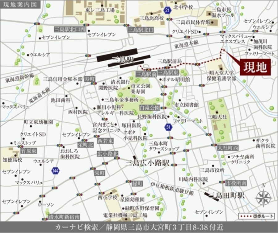 JR東海道新幹線・JR東海道本線・伊豆箱根鉄道駿豆線の3沿線が利用できる「三島」駅(JRはともに南口)まで徒歩11分の立地。東京駅まで1時間以内と通勤通学・休日のお出かけにアクセスの良い立地です。