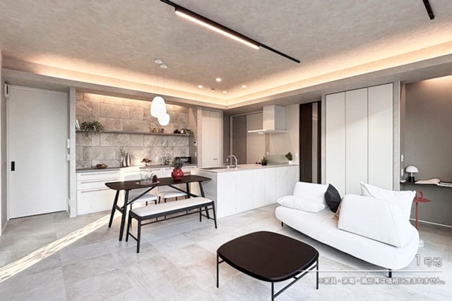 ホールはタイル、LDKはフロアタイルのホテルライクな空間。大きな窓が開放感と洗練された雰囲気を演出