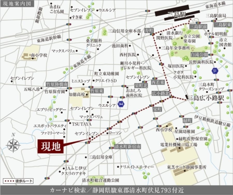 JR東海道線「三島」駅まで徒歩24分、伊豆箱根鉄道駿豆線「三島広小路」駅まで徒歩14分、国道1号線まで車で約2分とマイカー通勤・休日のお出かけやお買い物等、アクセスの良い立地です。