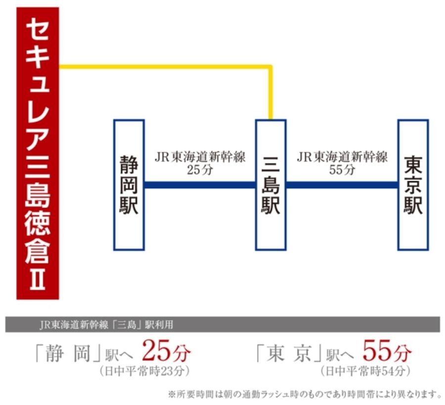 JR東海道本線「三島」駅まで徒歩24分、JR東海道新幹線「三島」駅から「東京」駅まで約1時間と通勤・通学・休日のお出かけやお買い物にアクセスの良い立地です。