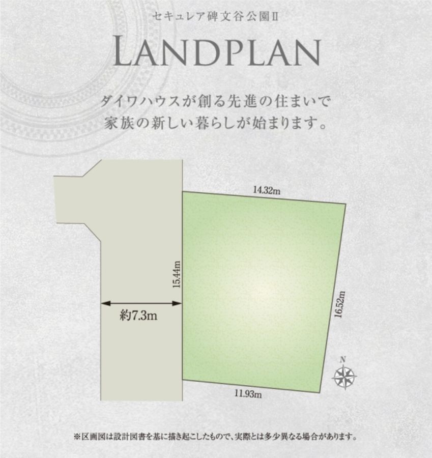 多彩なプランを描ける約65坪の敷地。前面道路7.3mで駐車も快適。