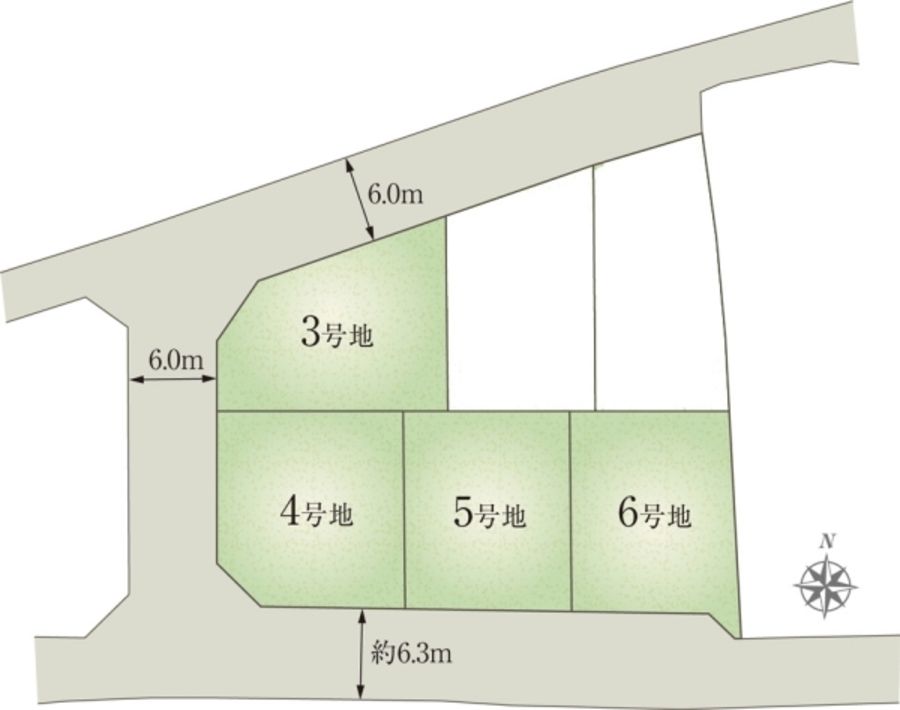 - 160.76m2(3号地)、164.35m2(4号地)、153.13m2(5号地)、153.94m2(6号地) 私道負担なし