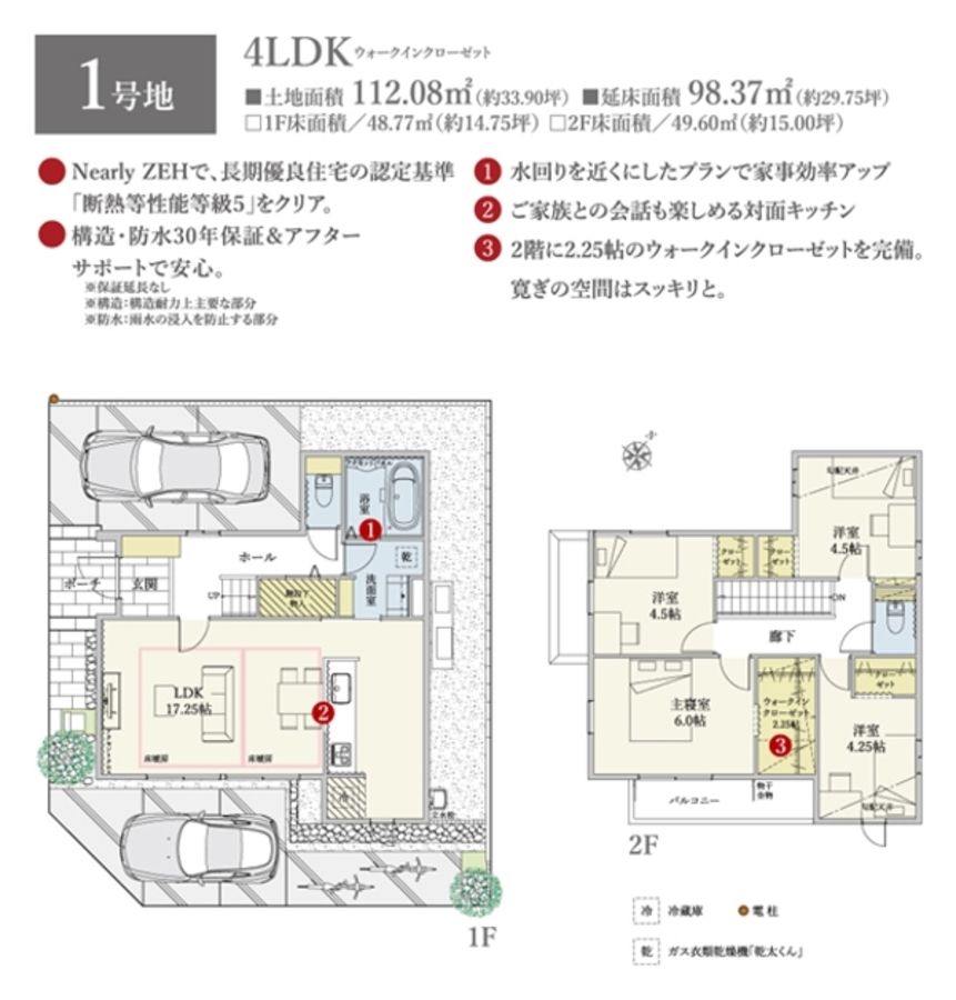 - 112.08m2(1号地)、108.43m2(4号地) 全て私道負担なし