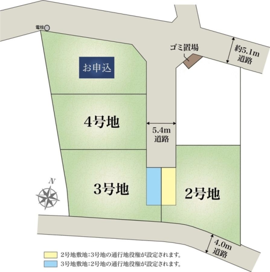 ※2号地敷地面積224.95m2のうち18.9m2の部分、3号地敷地面積220.53m2のうち18.9m2の部分には、互いの通行地役権が設定されます。