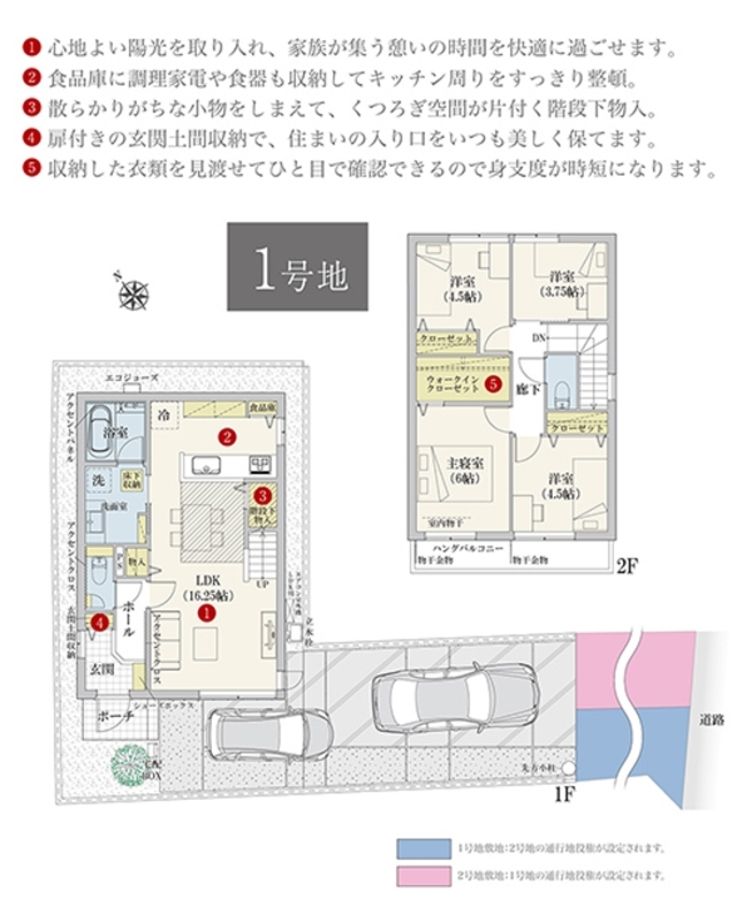 ※1号地敷地面積158.60m2のうち43.57m2の部分には2号地の通行地役権が設定されます。