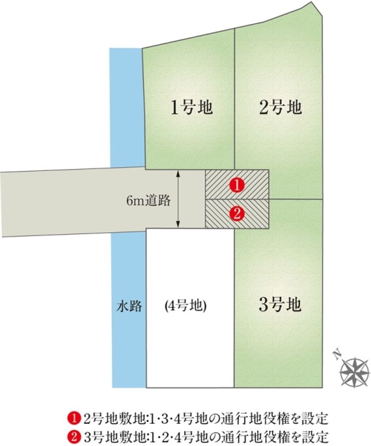 ※2号地の敷地面積172.25m2のうち18.55m2の部分には1・3・4号地の通行地役権を設定します。