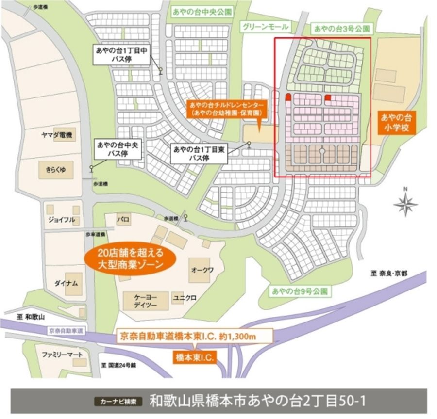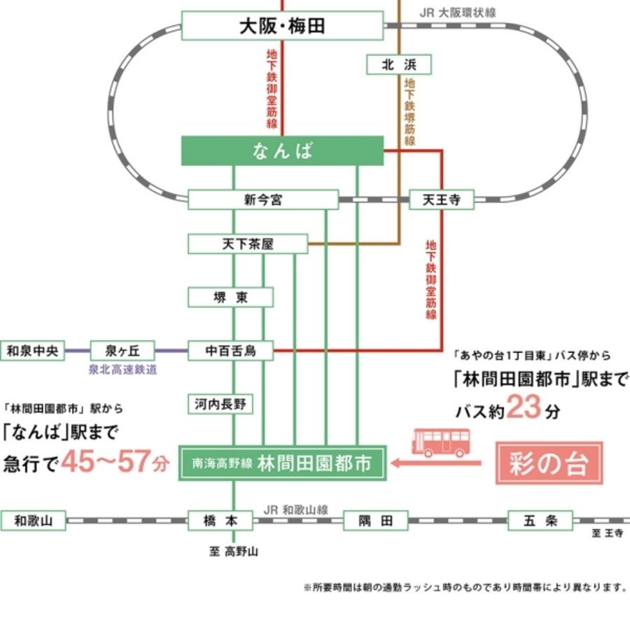 - 南海電鉄高野線「林間田園都市」駅 南海りんかんバス約23分 「あやの台1丁目東」バス停徒歩4分~5分