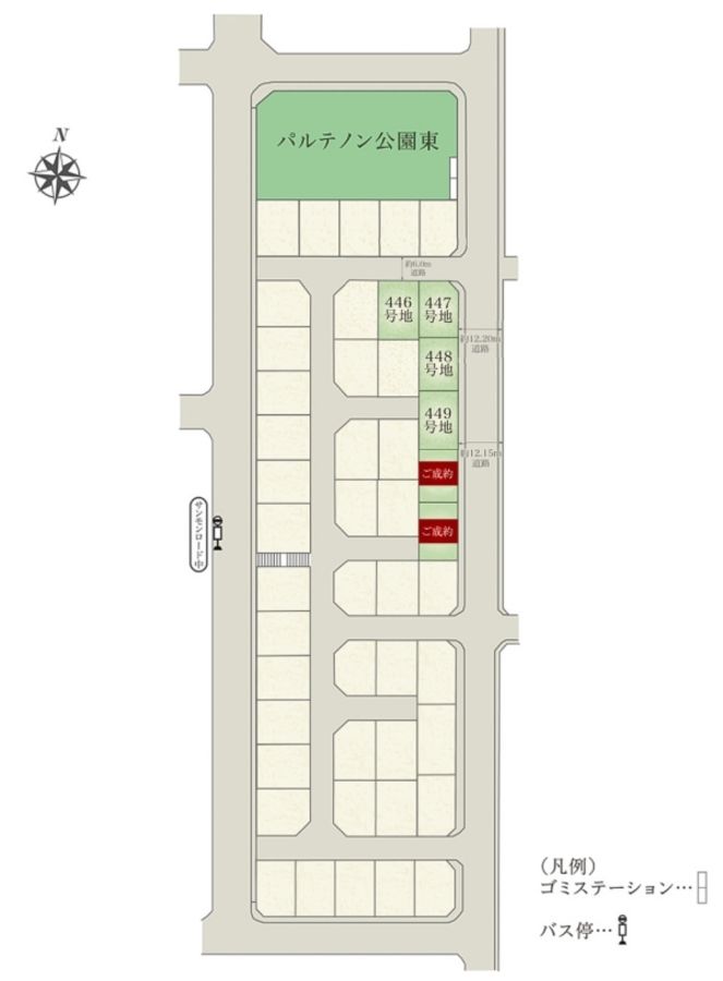 - 154.48m2(446号地)、144.58m2(447号地)、154.48m2(448号地)、146.76m2(449号地) 全て私道負担なし