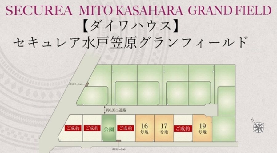 (物件概要補足)●物件名称/セキュレア水戸笠原グランフィールド (建築条件付宅地分譲)●所在地/茨城県水戸市笠原町1482番18他●総区画数/20区画●当社区画数/20区画●今回販売区画数/3区画●売主/大和ハウス工業株式会社●販売会社(取引態様)/売主●交通/JR常磐線「水戸」駅まで県庁シャトルバス約23分(徒歩9分の「県庁」バス停乗車)●開発面積/6044.32m2●工事完了年月/令和7年2月造成済 3区画●販売価格/1,350万円~1,440万円●最多販売価格帯/1,400万円台 2区画●その他の費用/-●地目/宅地●建ペイ率・容積率/60%・200%●主たる設備等の概要/電気:東京電力(他の小売電気事業者の選択も可能です)、ガス:個別プロパンガス、水道:公営水道、下水:公共下水道、雨水:宅地内浸透施設●道路の幅員/3.3m、6.35m(アスファルト舗装)●土地の権利形態/ 所有権●用途地域/都市計画 無指定地域/市街化調整区域(開発許可等による分譲地)
