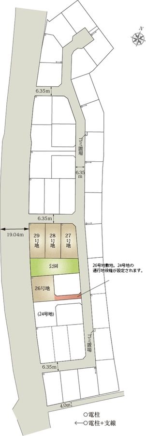 ※26号地敷地面積320.41m2のうち、56.13m2の部分には、24号地の通行地役権が設定されます。