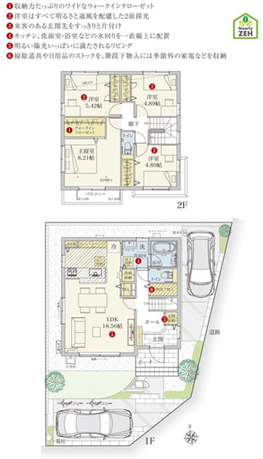 ファミリークローゼットやパントリー、2台駐車可能なカースペースなど、