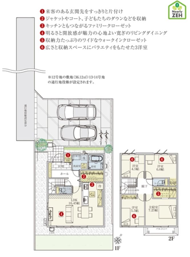12号地の土地面積201.24m2のうち36.12m2の部分には、13号地・14号地の通行地役権を設定します。