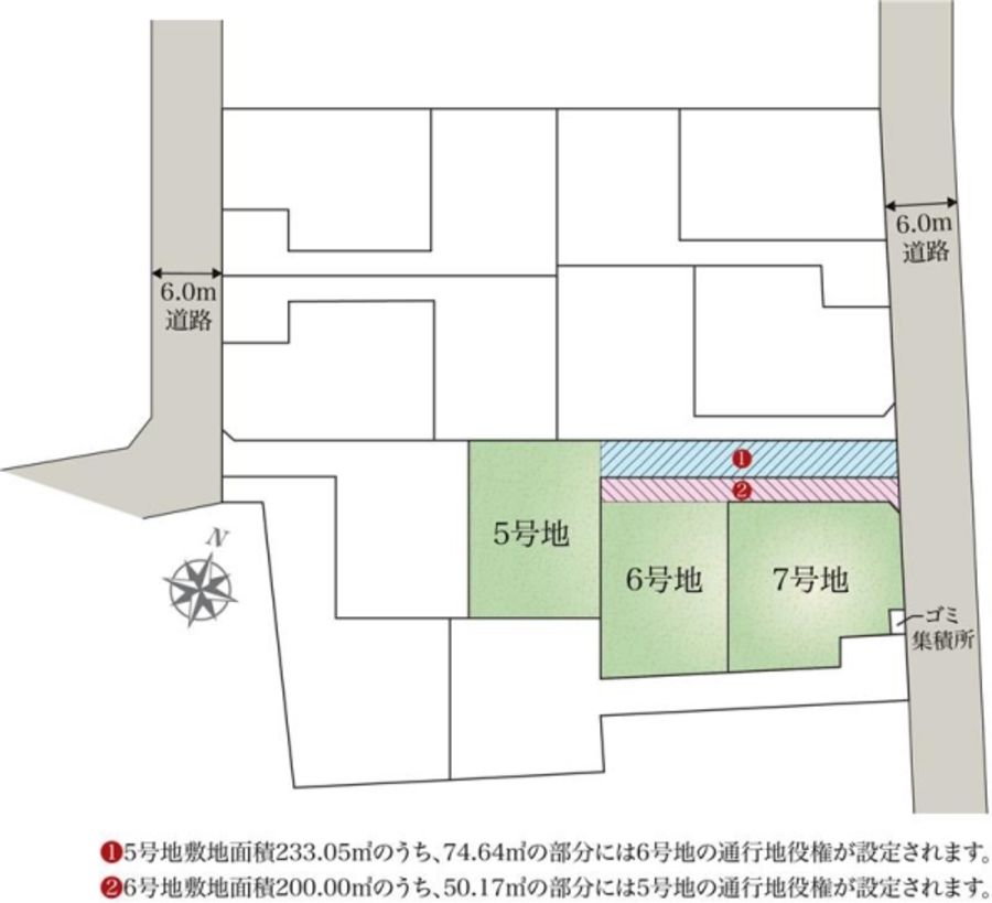 - 233.05m2(5号地)、200.00m2(6号地)、181.00m2(7号地) 私道負担なし