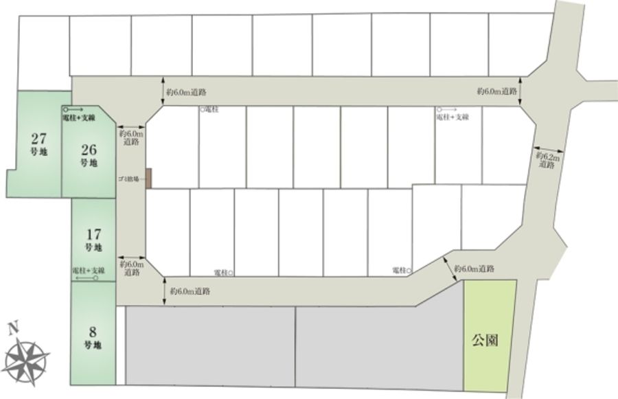 - 192.29m2(8号地)、152.42m2(17号地)、199.41m2(26号地)、215.55m2(27号地) 私道負担なし