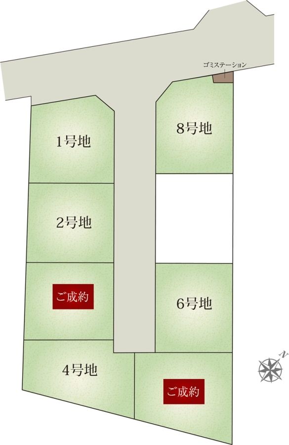 - 100.49m2(1号地)、100.49m2(2号地)、100.53m2(4号地)、100.49m2(6号地)、101.50m2(8号地) 私道負担なし
