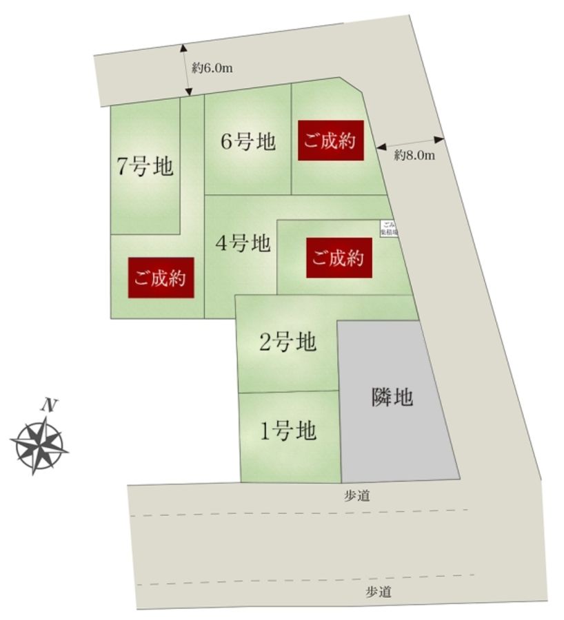 - 120.09m2(1号地)、155.25m2(2号地)、141.00m2(4号地)、120.14m2(6号地)、120.10m2(7号地) 私道負担なし