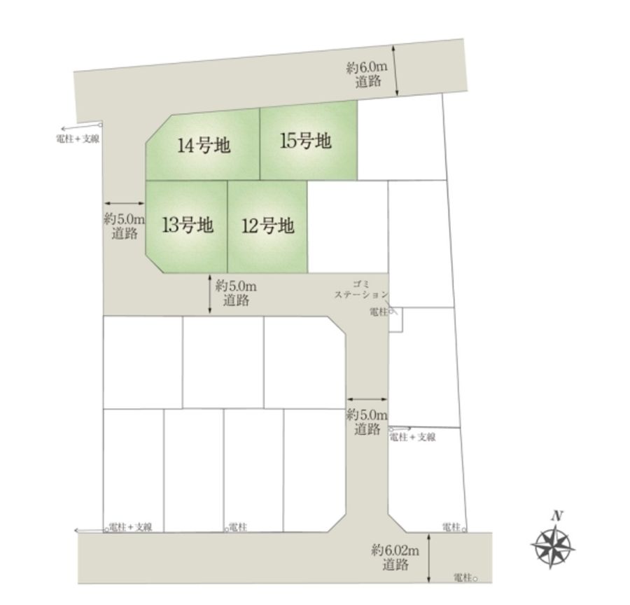 - 102.49m2(12号地)、102.51m2(13号地)、103.05m2(14号地)、103.04m2(15号地) 私道負担なし