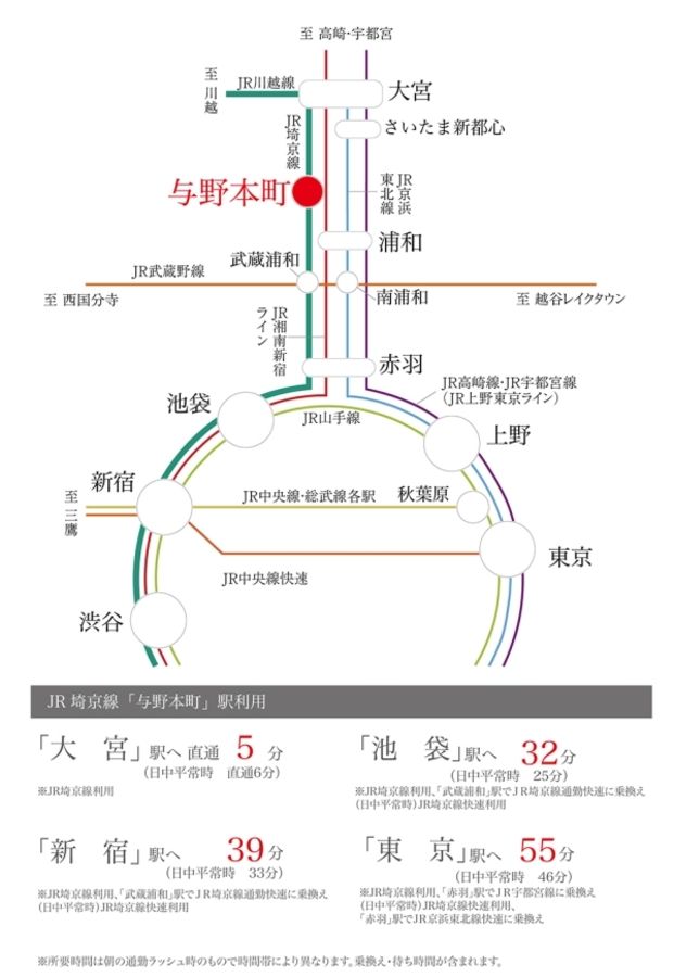 JR埼京線「与野本町」駅まで徒歩14分。毎日の通勤、通学に便利な立地。