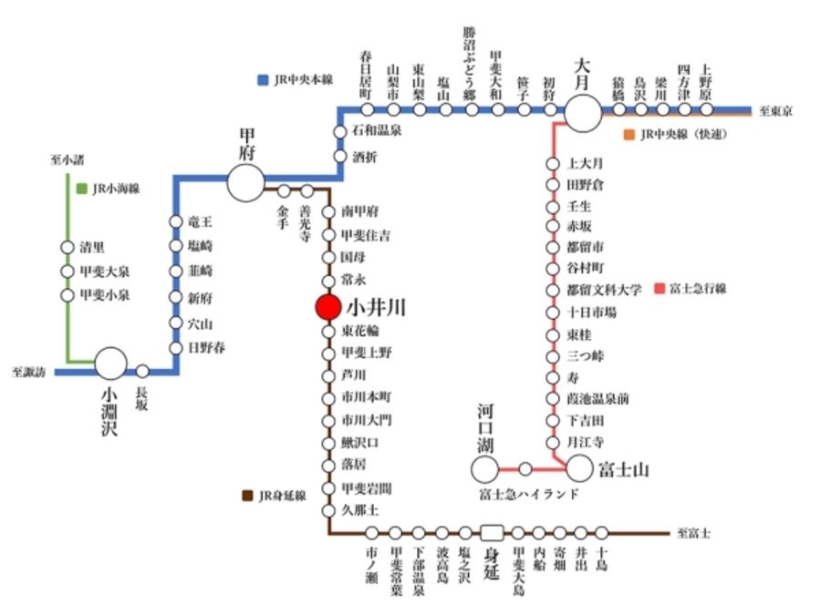 - JR身延線「小井川」駅まで車で約12分(約7,680m~7,690m)