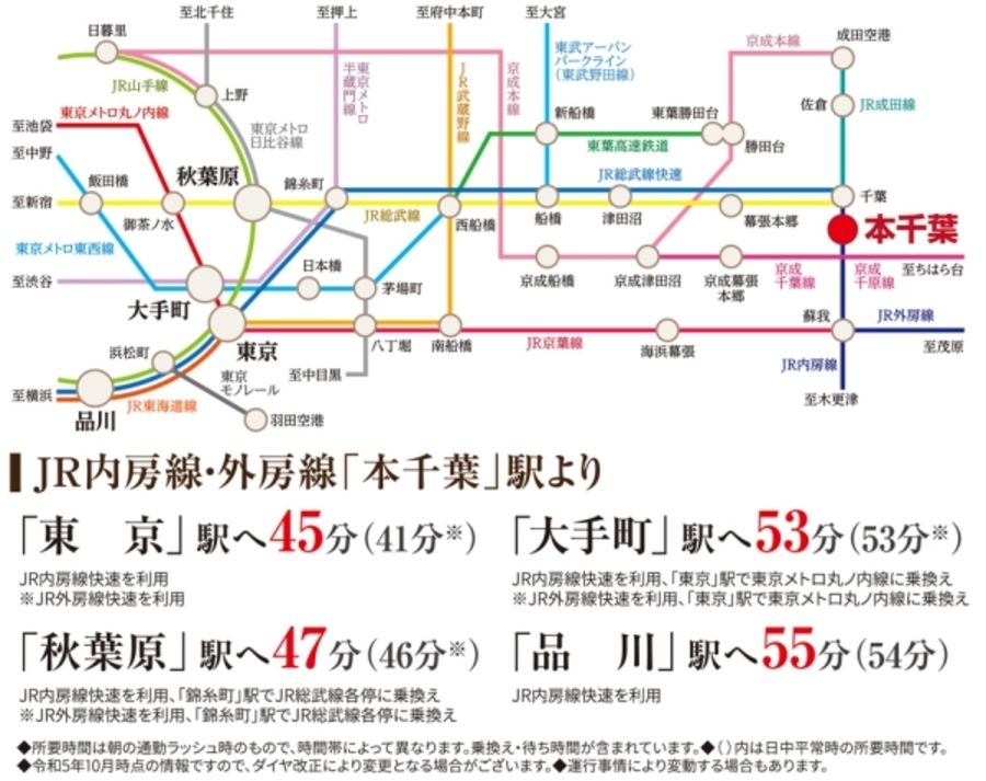 JR外房線「本千葉」からJR総武線快速「東京」駅まで直通45分※快速利用。朝の通勤ラッシュ時