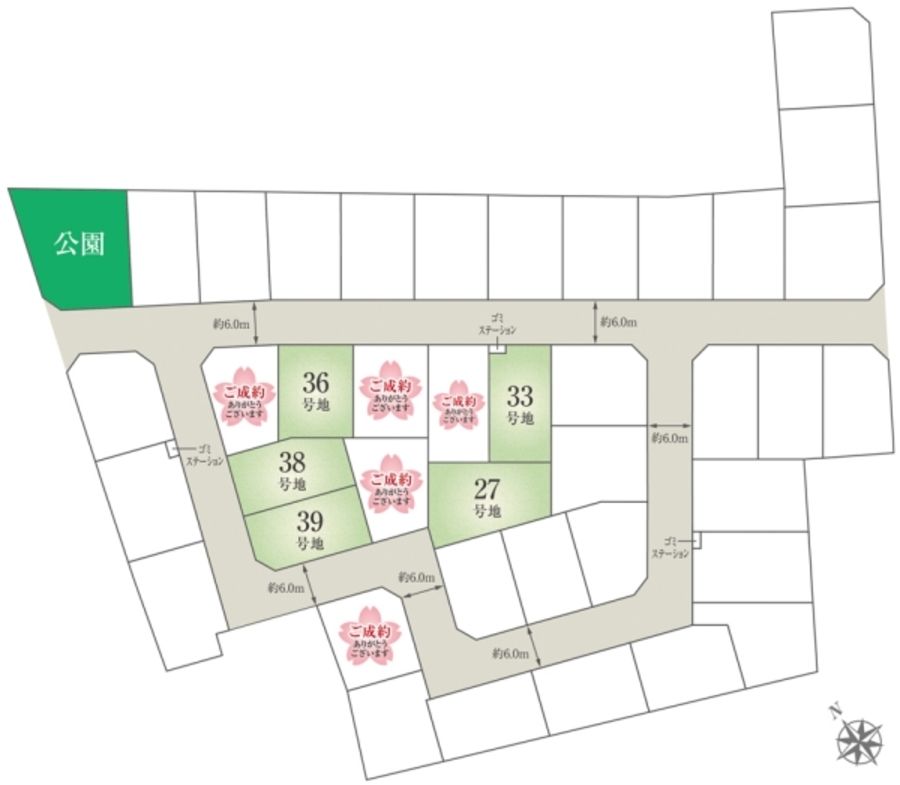 - 156.30m2(27号地)、128.76m2(33号地)、125.90m2(36号地)、125.91m2(38号地)、125.90m2(39号地) 私道負担なし