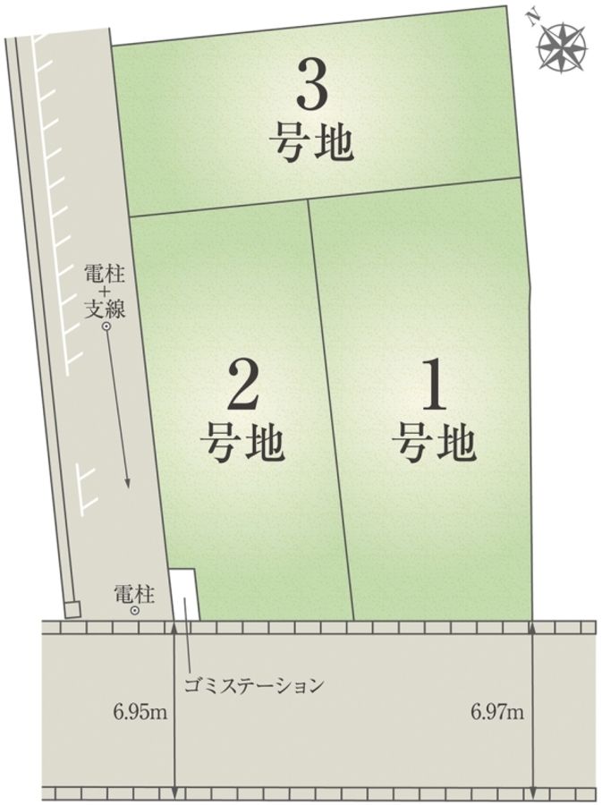 - 125.69m2(1号地)、109.36m2(2号地)、100.17m2(3号地) 私道負担なし