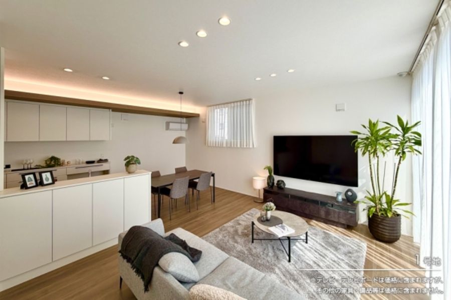 1階天井高2720㎜の伸びやかな空間に、大型テレビを備えたゆとりのリビング