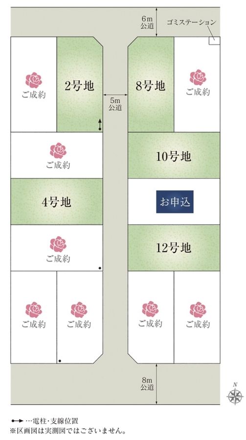 - 183.58m2(2号地)、177.71m2(4号地)、180.25m2(8号地)、180.20m2(10号地)、180.25m2(12号地) 私道負担なし