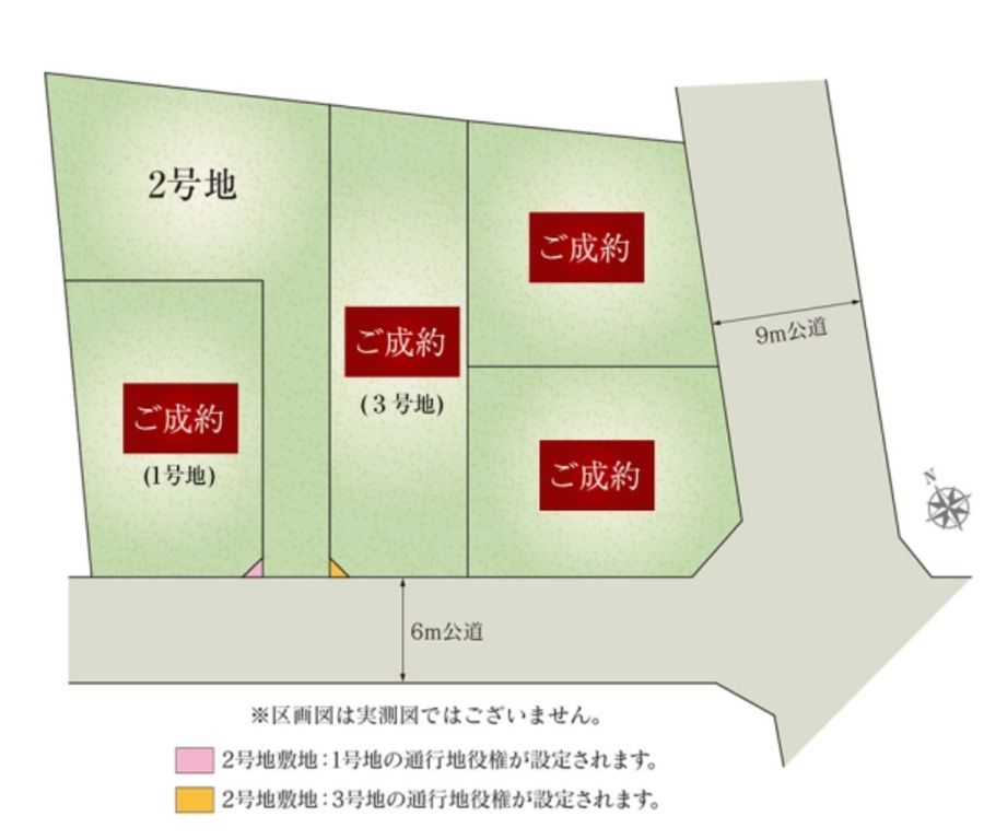 ●2号地敷地面積200.91m2のうち、0.49m2の部分には1号地の通行地役権が、0.49m2の部分には3号地の通行地役権が設定されます。