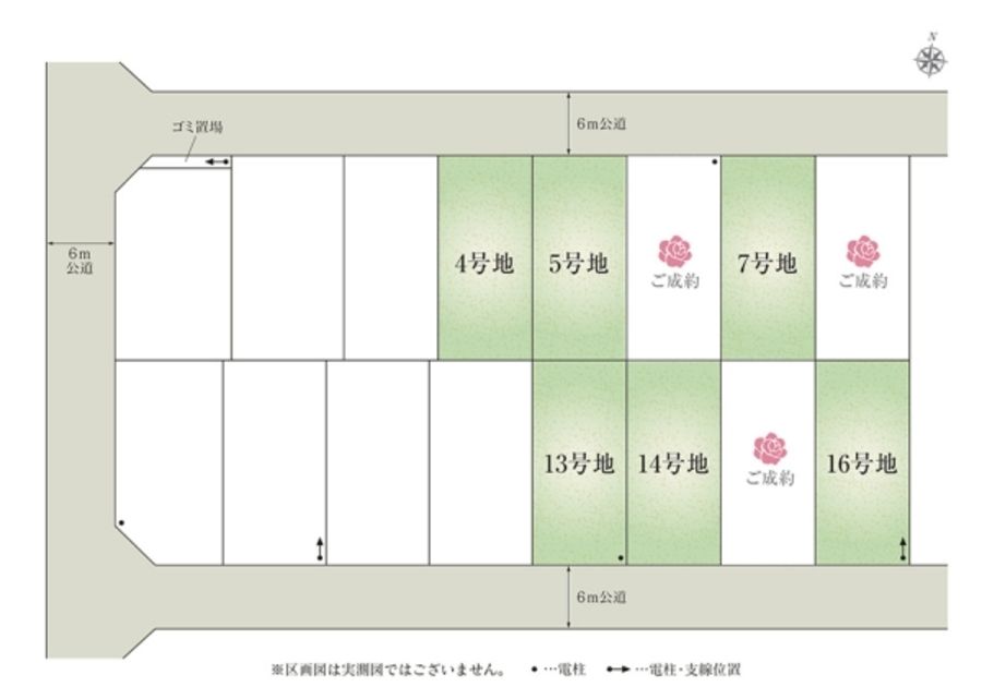 - 166.24m2(7号地、14号地、16号地)~166.26m2(13号地) 全て私道負担なし
