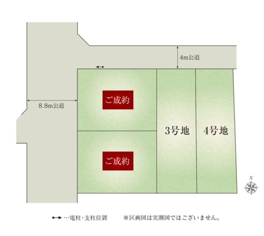 - 148.79m2(1号地)、148.79m2(2号地)、148.78m2(3号地)、148.79m2(4号地) 全て私道負担なし
