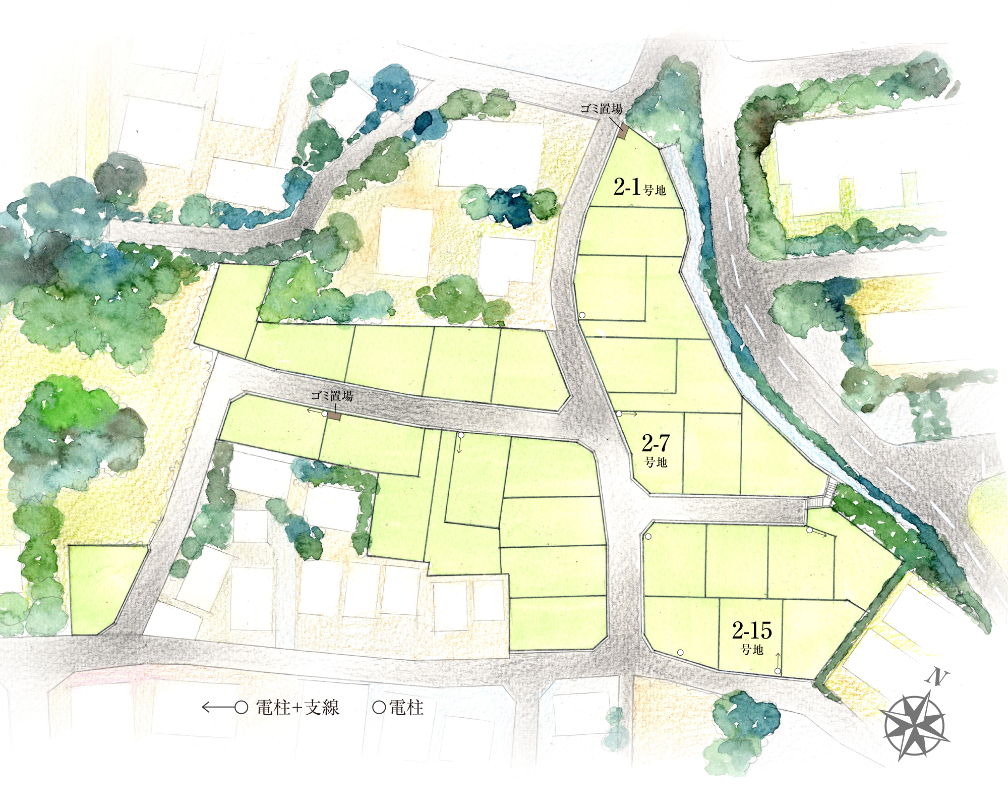 - 128.56m2(2-1号地)、125.36m2(2-7号地) 全て私道負担なし