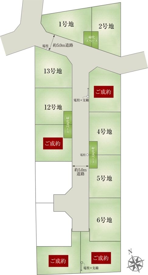 - 3LDK(1号地、2号地、6号地、12号地、13号地)、4LDK(4号地、5号地)